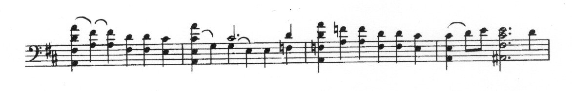 Und jetzt, in der 3. Zählzeit ist eindeutig ein Dominantseptakkord, genauer: die Zwischendominante zur Subdominante. Am Taktende ist wieder eine Pause im Baß.