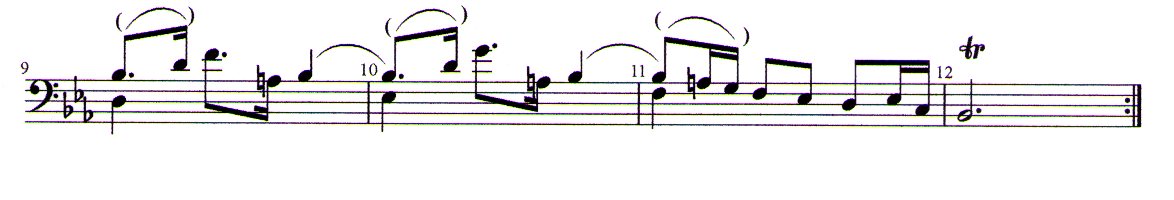 Now one expects the final measure of the “Sarabande” with the tonic. However, the Rel is strongly emphasized with it, the end of the movement is thus delayed. JSB now writes a slur on each of the two sixteenth notes in the 1st and 2nd beats. This causes accentuations of the top note Eb4 and the note Eb3 on the 3rd beat.