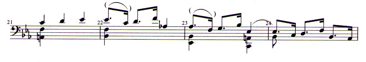 Although the interpretation of this movement is possible with the today’s commonly used concave bow, the curved bow has great advantages at central points of the composition, eg in m 21, where the bass A2, the third of DD, finally appears for the 1st time, can be fully sustained with the curved bow for a quarter note. The same applies to the root C2 of the s6-chord in m 23. The ties and chords in mm 29ff can only be performed in the notated form with the curved bow.