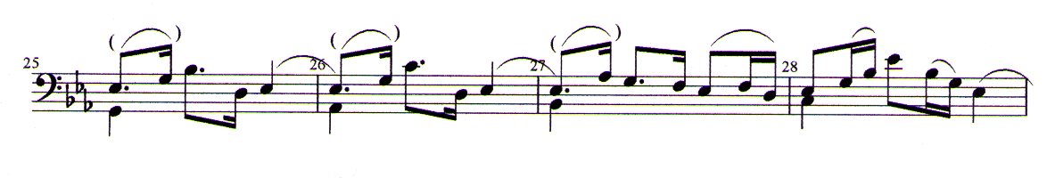 The end of the phrase arrives back on the note Eb3, the root of the tonic or the third of the Rel, which is tied, as in mm 4, 23 and 25f. One last time, this Eb3 is emphasized and reinforces the tonic character at the end of the measure.