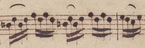 Nun kann aber auf einer einzigen Note [a3] nicht ein Bindebogen aufhören und ein zweiter beginnen. Entweder ist das eine Verlängerung des 4-B nach vorne oder der 2-B ist um eine 16tel-Note nach hinten verrutscht. Letzteres scheint mir an dieser Stelle am plausibelsten zu sein, weil wir die gleichen Tonhöhen im selben Takt [2. Takthälfte] ja nochmals bekommen: