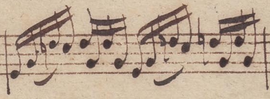 In dieser Passage von 2 Takten würde man zunächst denken, AMB hat sich hier drei- oder viermal verschrieben … , daß die Bindebögen eigentlich alle gleich sein müßten. Also das Ende dieser Bindebögen ist immer eindeutig, bis auf den letzten, da hat AMB wegen eines Zeilensprungs vergessen, in der nächsten Zeile darunter, den Bindebogen fortzuführen. Das ist ganz eindeutig so, weil am Zeilenende darüber der Bindebogen ganz weit über das Notensystem hinausgeführt ist. Aber er wird nicht in der nächsten Zeile fortgeführt. Also, da ist offen, wo er endet, aber die anderen 3 Bindebögen enden immer am Ende der 2. oder 4. Zz [oder doch nicht?, s. u.]. Nun, was haben wir denn hier eigentlich? Wir haben eine Tonleiter. Die könnte auch so klingen, wenn JSB sie nicht gebrochen hätte [herunter oktaviert, um sie in den Tonraum d2-c4 zu bringen], klänge sie so: