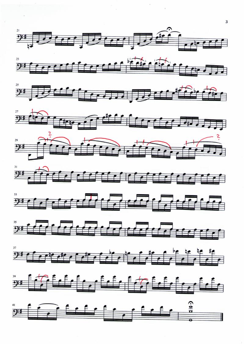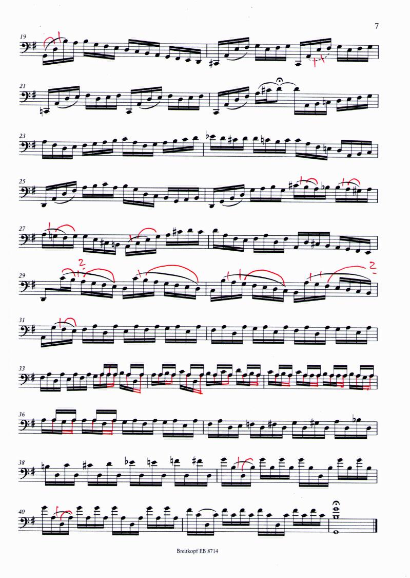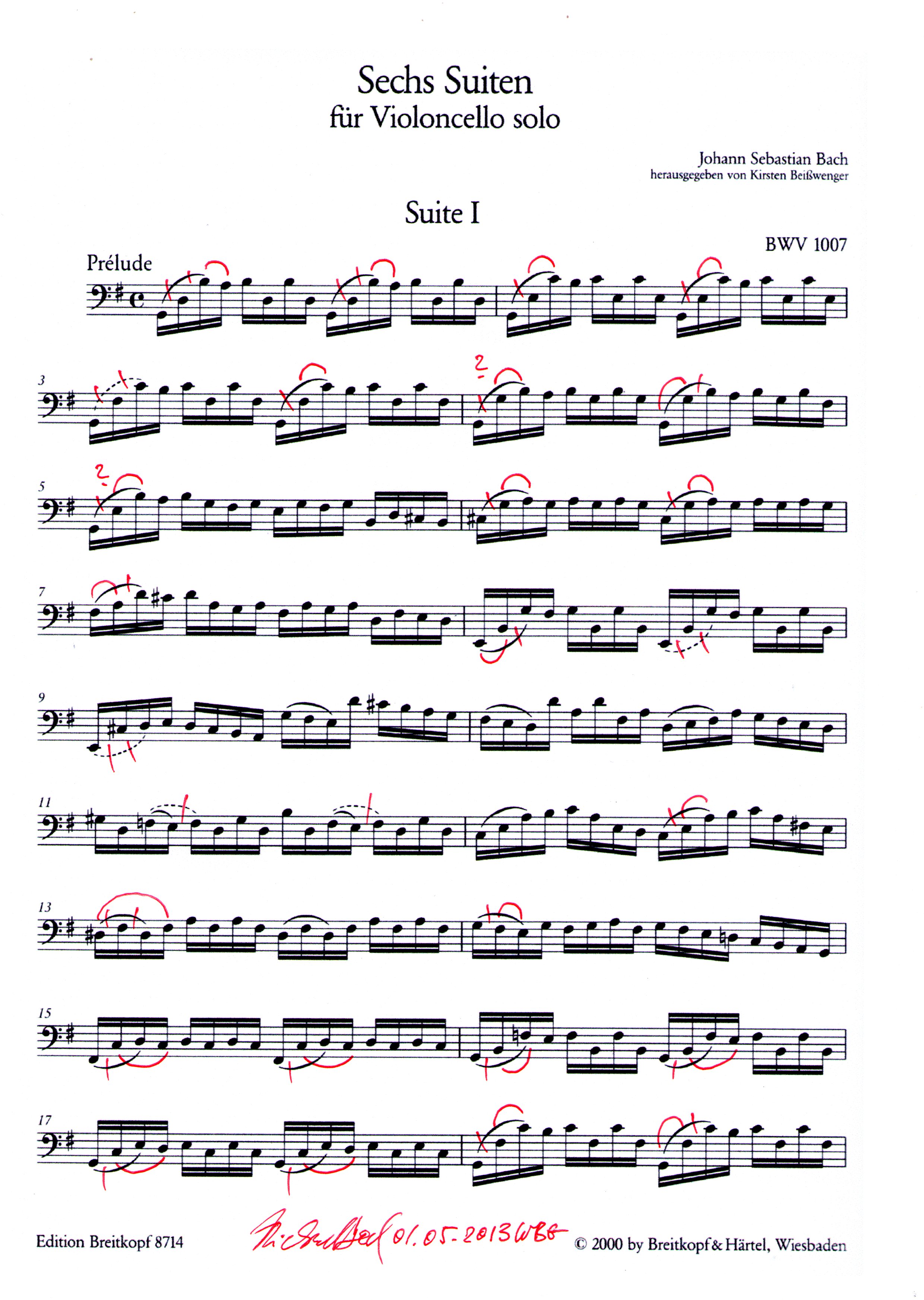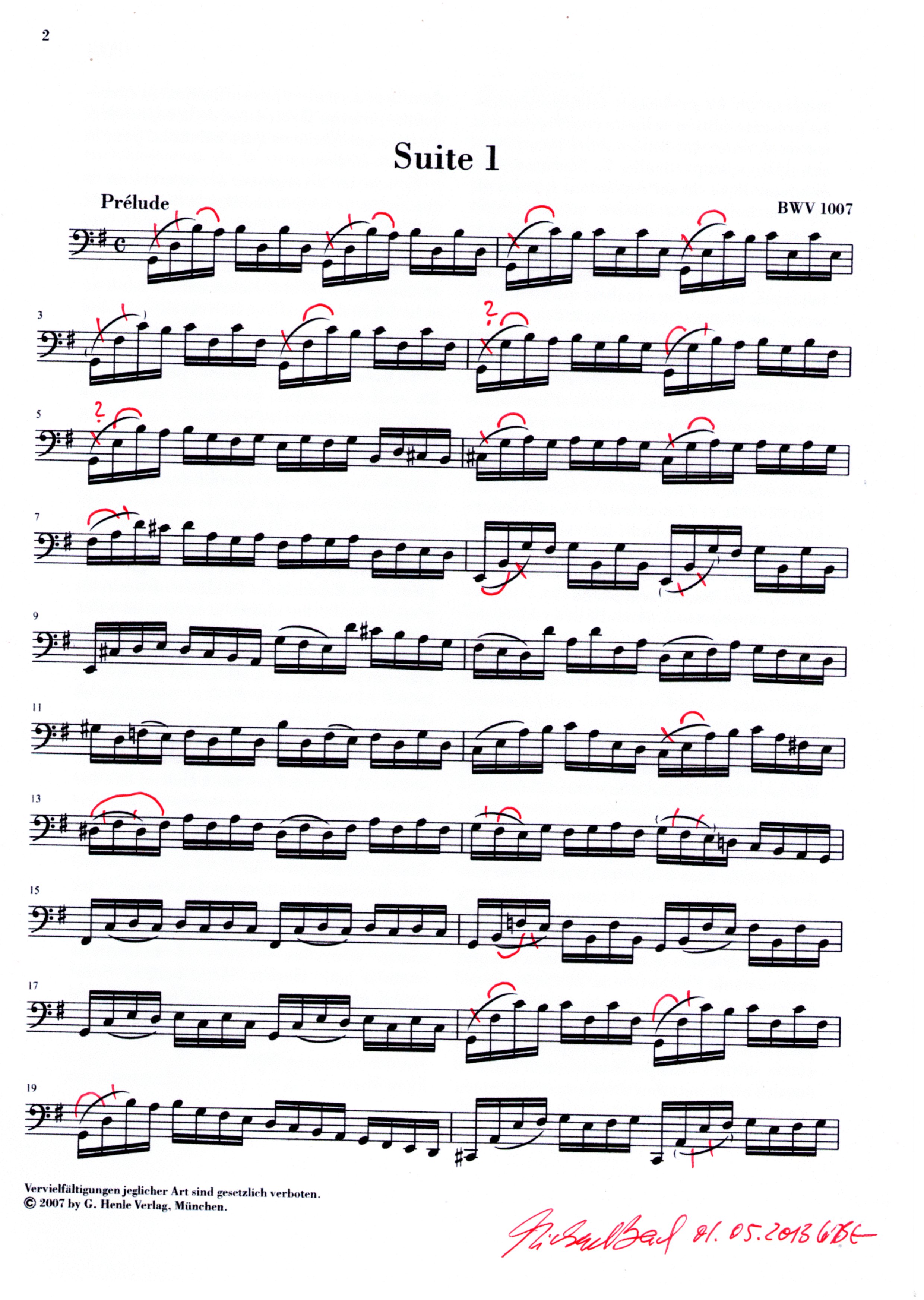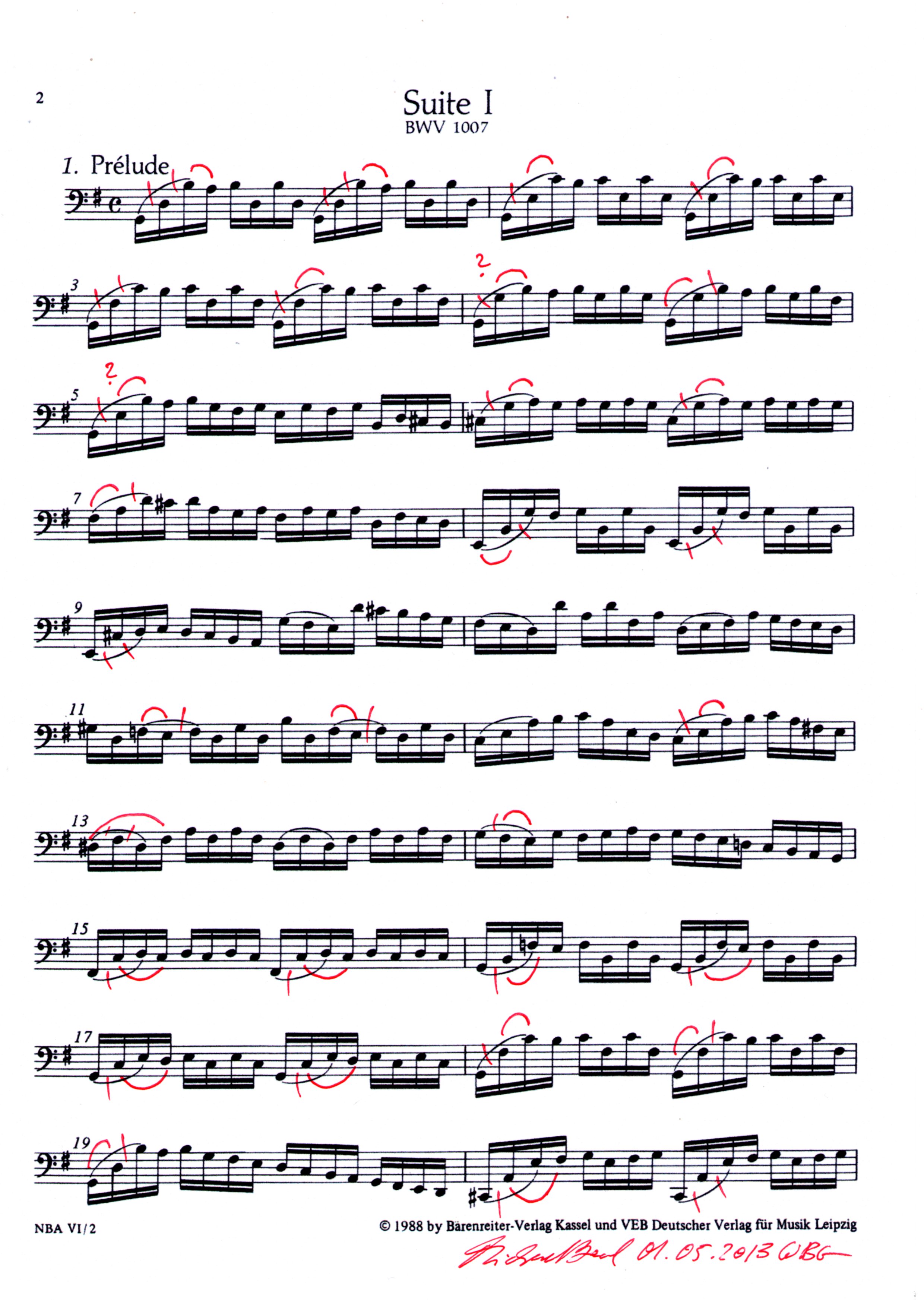 Als erstes Beispiel für die Diskrepanzen in der Deutung der Bindebögen möchte ich den allerersten Satz der Suiten für Violoncello als Beispiel heranziehen.