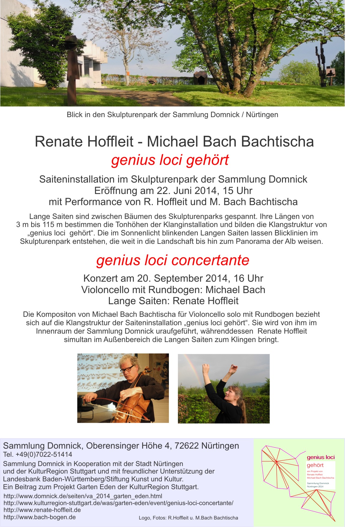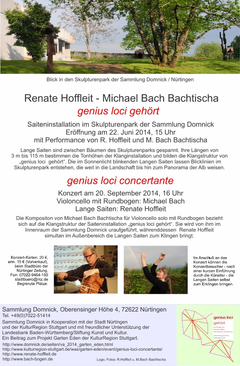 Anläßlich der konzertanten Aufführung „genius loci concertante” am 20. September 2014 werden die Langen Saiten im Außenbereich gespielt simultan mit der Uraufführung von „locus amoenus” für Cello mit Rundbogen im Innern des Gebäudes. Die Zuhörer befinden sich zunächst ebenfalls im Innenraum, folgen aber am Ende der Aufführung dem Cellisten in den Außenbereich, wo die Klänge der Langen Saiten der Saiteninstallation den Abschluß bilden.