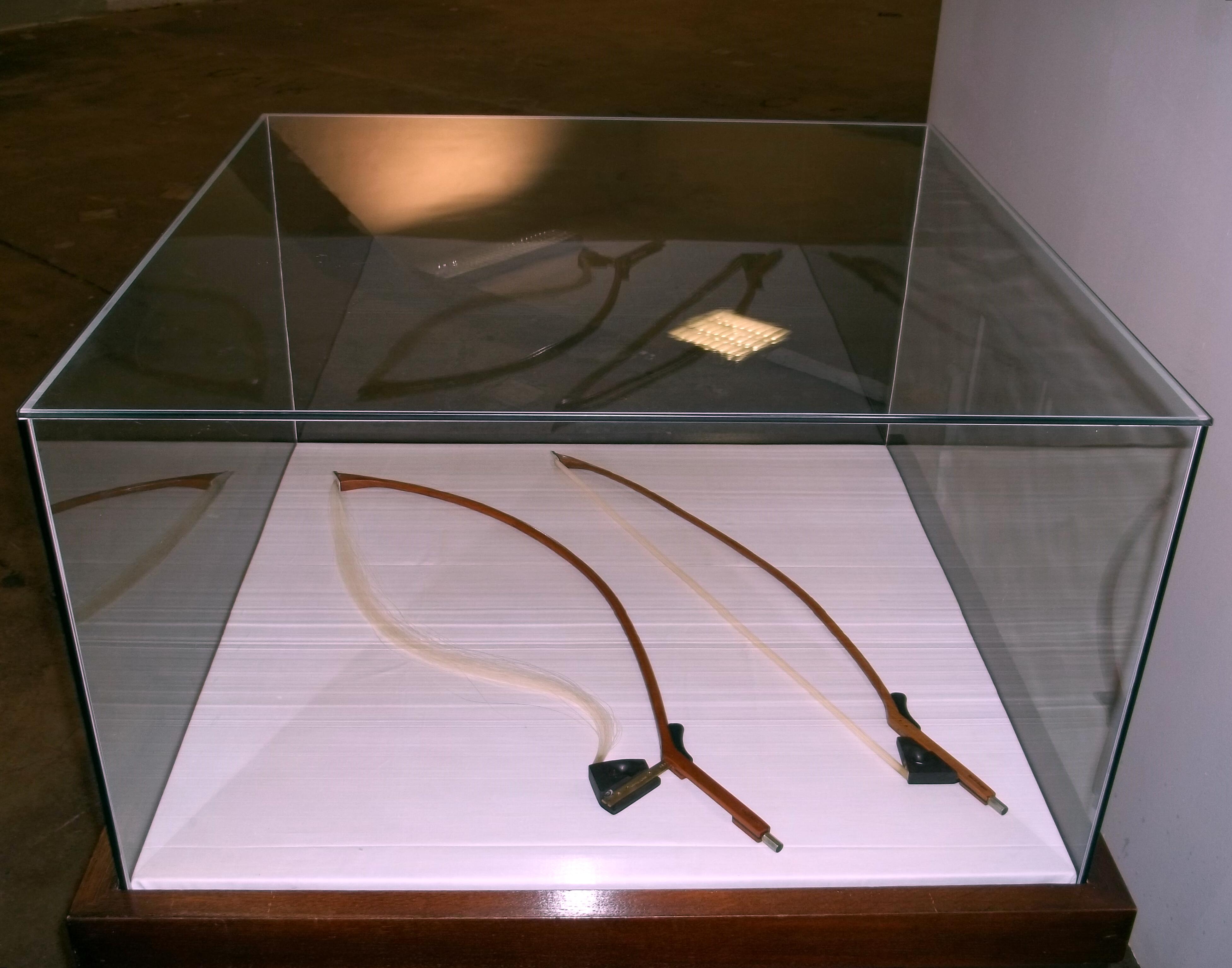 MB: Ja, ich hab’ damals [Anfang der 90er Jahre] mit diesen Experimenten aufgehört aus einem Grund: Ich konnte das Phänomen nicht wirklich erklären und ich konnte es auch nicht mit Sicherheit hervorrufen, also z. B. eine bestimmte Frequenz. Das passiert ja sehr leicht, daß man da zusätzlich noch andere Frequenzen hört, je weiter man … Also, ich rede jetzt von einer leeren Saite, die ich versuche, mit dieser Technik anzuspielen. Je weiter ich in Richtung Saitenmitte mit dem Bogen gerate, desto tiefer werden die Töne [“Untertöne”]. Das geht über die große Septim weiter nach „unten”, ich weiß nicht mehr, was das noch war, vielleicht eine große Dezim, egal, und irgendwann hört das natürlich auf, weil sich das dann nicht mehr praktisch ausführen läßt, weil die Saite nicht mehr den nötigen Widerstand dem Bogen entgegenbringt.